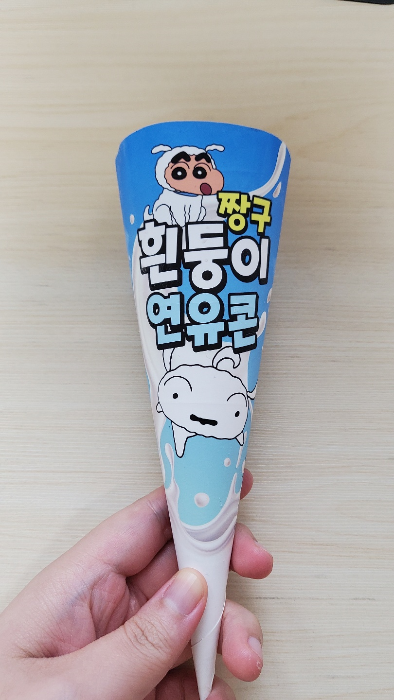 다음은 짱구 흰둥이 연유콘입니다. 짱구 너무 귀여운 거 아닌가요?ㅠㅠ  콘이기도 하고, 150ml라 그런지 245칼로리! 그래서 가격도 비싼 건지 2,000원입니다!