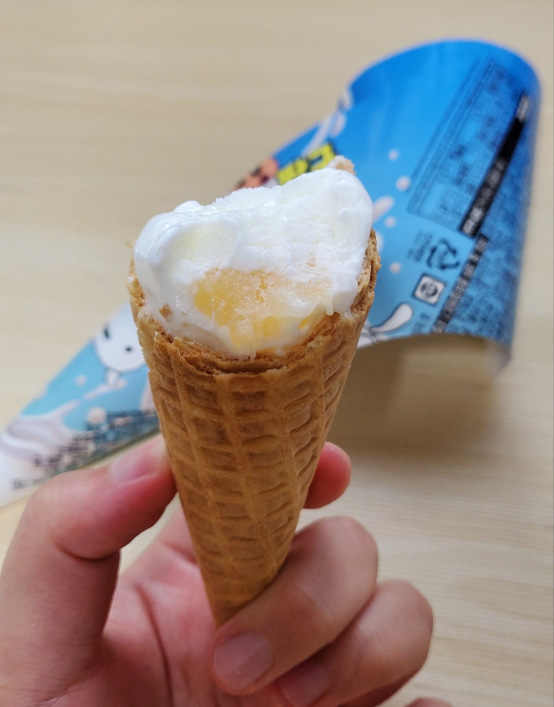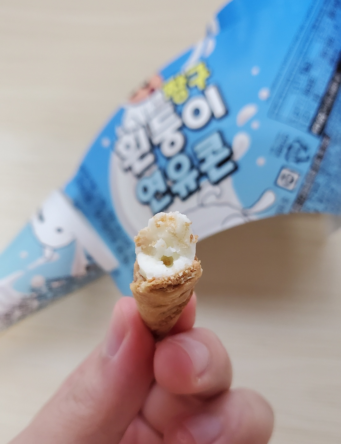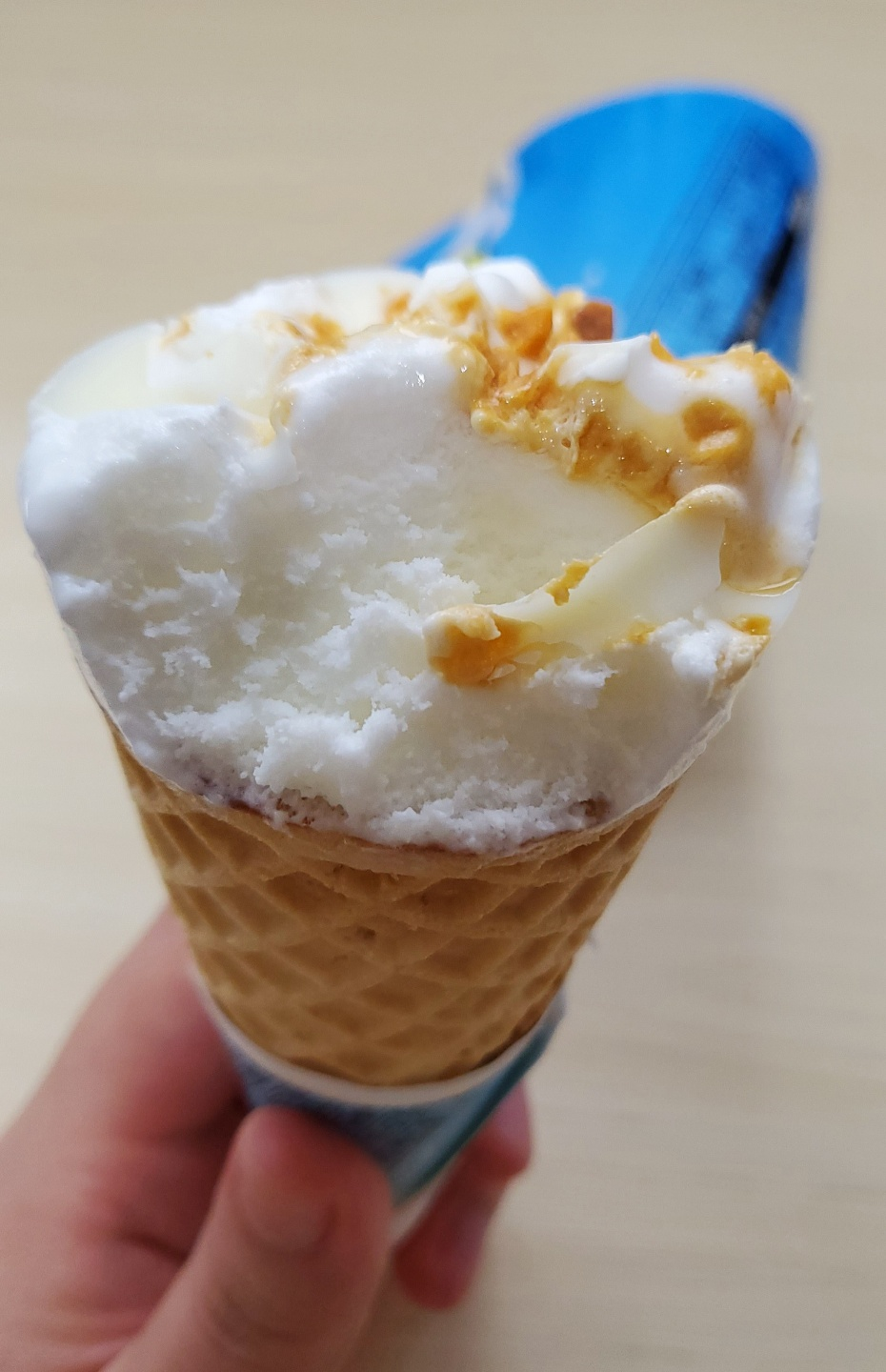 그리고 콘 아이스크림에서 빠지면 안 되는 초코! 콘의 끝 부분에는 화이트 초콜릿이 채워져 있습니다.ㅎㅎ 화이트 초콜릿은 별로 안 좋아하는데 야무지게 다 먹어버렸어요.ㅎㅎ 요즘은 콘 아이스크림 끝에 플라스틱이 없네요.ㅎㅎ 거기 붙은 초콜릿까지 다 먹겠다고 혀를 한 두 번 베인 게 하루 이틀이 아닌데ㅜㅋㅋㅋㅋㅋ 추억이네요.ㅎㅎㅎ