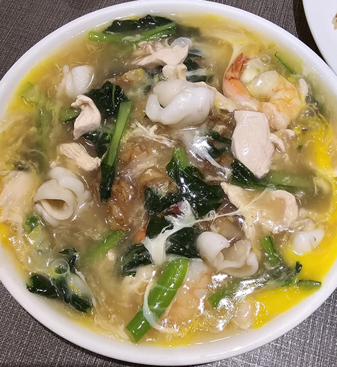 사실 한국에 돌아와서까지 저는 이 음식이 가장 생각났어요. 녹진하고 걸죽한 국물에 재료도 아낌없이 들어가 있고, 국수도 상당히 부드러워서 죽처럼 먹기 좋았습니다. 맛은 새우와 닭이 들어간 계란죽 같은 맛인데 청경채가 들어가 상큼함까지 더해 있었어요. 지금도 다시 먹고 싶은 요리예요.ㅠㅎㅎ