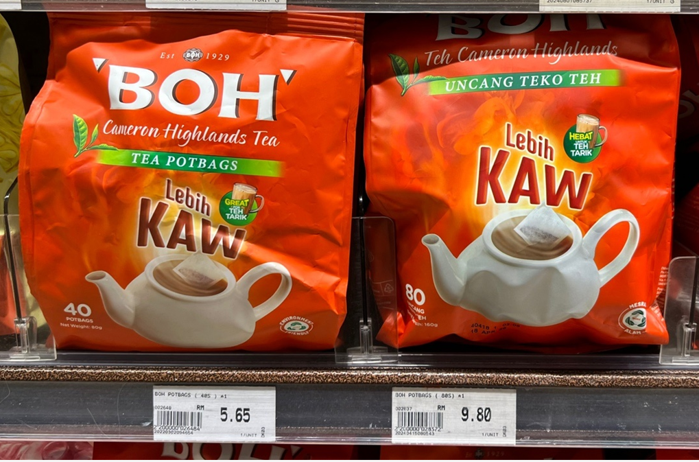 말레이시아에서 유명한 차 브랜드이죠.ㅎㅎ Boh입니다. 저도 박스로 된 RM14.90 짜리를 사 와서 한참 잘 마셨는데 티백 100개가 들어 있어서 정말 오래 마셨답니다.ㅎㅎㅎ Kaw라고 써 있는 것은 '더 진하다'라는 의미예요. 만약 더 진한 차를 마시고 싶으면 Kaw가 써 있는 것을 고르면 됩니다. ㅎㅎ
