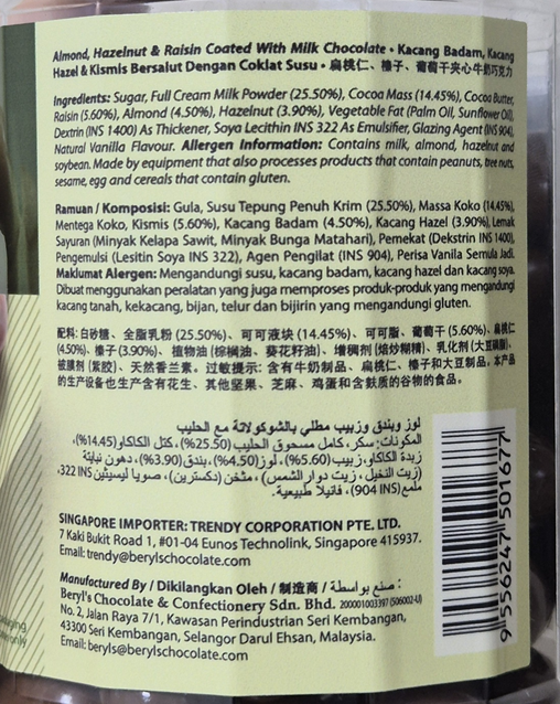 말레이시아 면세점에도 있는 유명한 베릴스 초콜릿이죠! 저는 아몬드만 들어있는 빨간색 통으로 사 왔었는데 이 학생은 녹색통의 베릴스 초콜릿을 선물해 줬어요. 뚜껑을 열면 진공포장지 위에 그림이 있는데, 바로 아몬드와 건포도 믹스입니다.