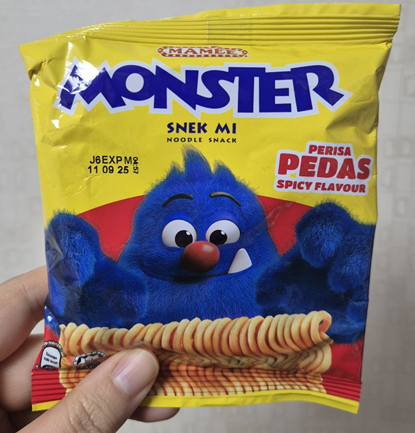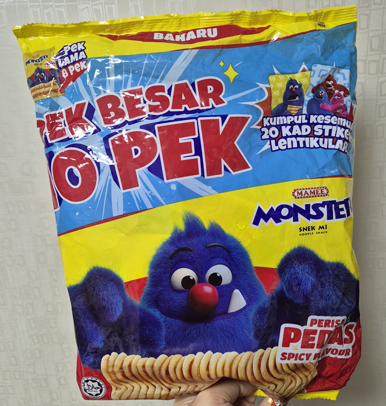 말레이시아 버전 뿌셔뿌셔 같은 과자예요. 라면땅처럼 라면이 있고 시즈닝이 들어 있습니다. 시즈닝은 큰 번들에 들어 있기 때문에 찾아서 뿌려 먹어야 해요.