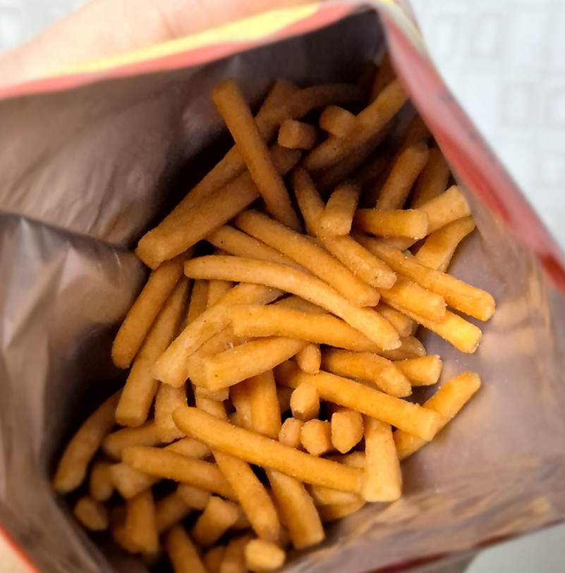 치토스랑 비슷하게 생겼는데 봉지를 뜯자마자 이 과자는 카레향이 확 납니다. 강황에 빠졌다가 나온 것 같이 시즈닝이 진하게 묻어 있는데 짭짤한 과자를 좋아하는 분들이 좋아하실 것 같습니다.