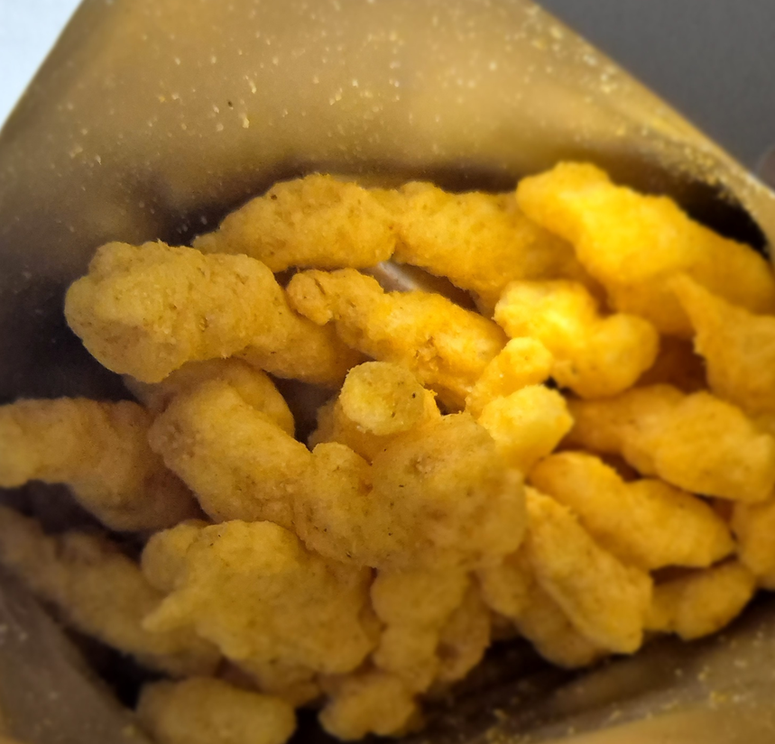치토스랑 비슷하게 생겼는데 봉지를 뜯자마자 이 과자는 카레향이 확 납니다. 강황에 빠졌다가 나온 것 같이 시즈닝이 진하게 묻어 있는데 짭짤한 과자를 좋아하는 분들이 좋아하실 것 같습니다.