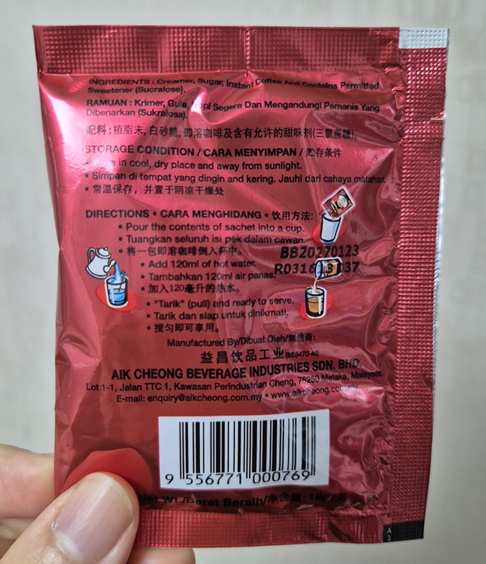 AIK CHEONG은 말레이시아에서 유명한 커피 브랜드인데 네 가지 맛 중에서 Regular 버전입니다. 이 커피도 3 in 1으로 커피, 크리머, 설탕이 한 번에 들어간 인스턴트 커피입니다.ㅎㅎ