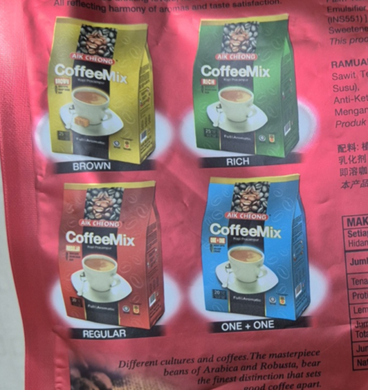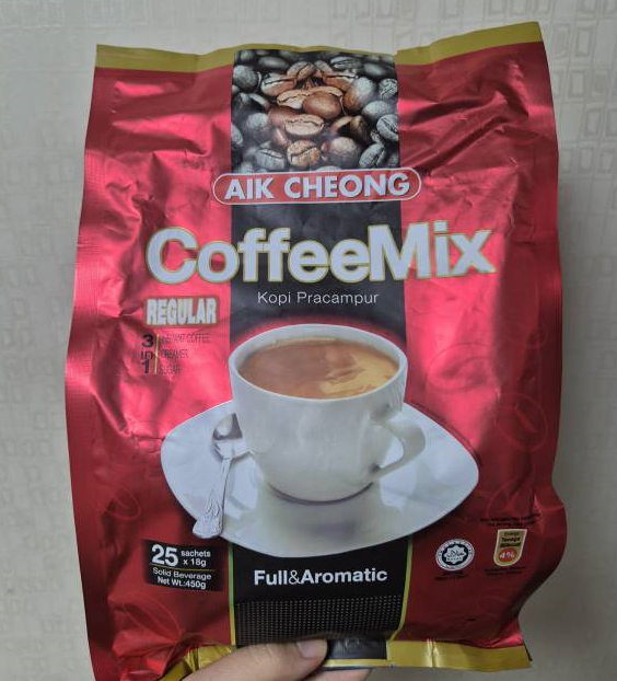 AIK CHEONG은 말레이시아에서 유명한 커피 브랜드인데 네 가지 맛 중에서 Regular 버전입니다. 이 커피도 3 in 1으로 커피, 크리머, 설탕이 한 번에 들어간 인스턴트 커피입니다.ㅎㅎ