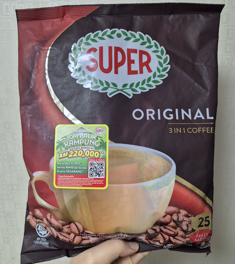 말레이시아의 대표 커피죠. ㅎㅎ SUPER에서 나온 커피입니다. 이 커피도 3 in 1 으로 커피, 크리머, 설탕이 함께 들어 있는 커피입니다.ㅎㅎ SUPER 브랜드의 대표적인 기본 맛이에요.ㅎㅎ
