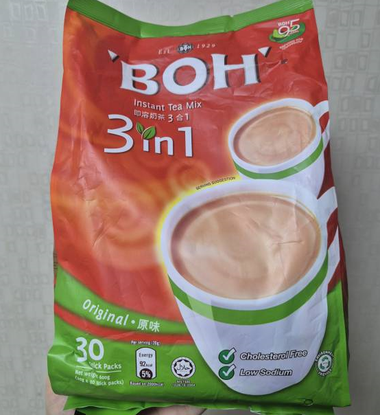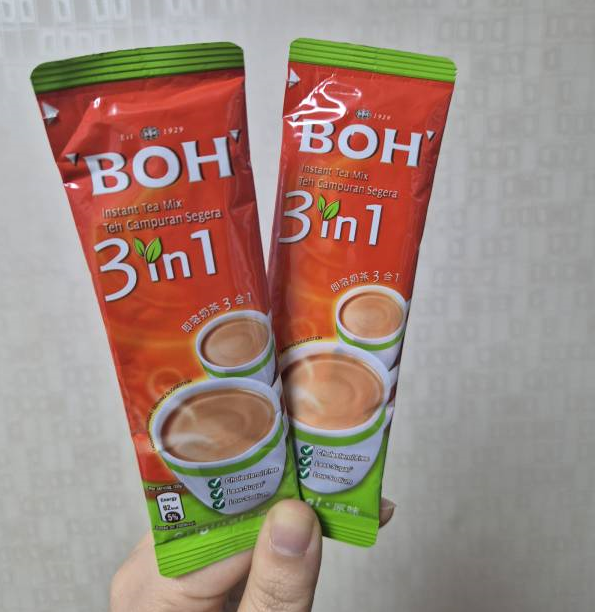 먼저 밀크티입니다. 말레이시아의 대표 홍차 브랜드인 BOH에서 나온 밀크티예요.ㅎㅎ 저도 이미 BOH에서 나온 홍차를 구입해 와서 마시고 있어요. BOH 3 in 1은 홍차, 크리머, 설탕을 하나에 넣은 제품입니다. 한 번들에 30개 스틱이 들어 있습니다.
