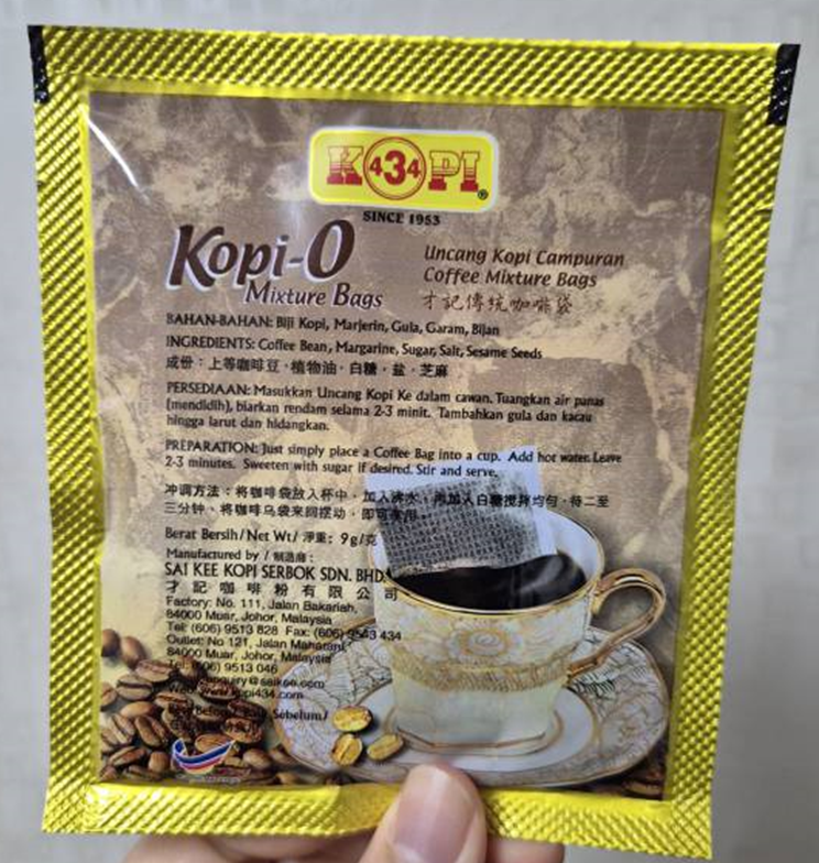 말레이시아의 전통 커피 브랜드인 Kopi434의 Kopi-O Mixture bags입니다. Kopi-O는 설탕이 없는 전통 말레이시아식 블랙 커피라고 해요. 고소하고 진한 풍미가 특징입니다.ㅎㅎ