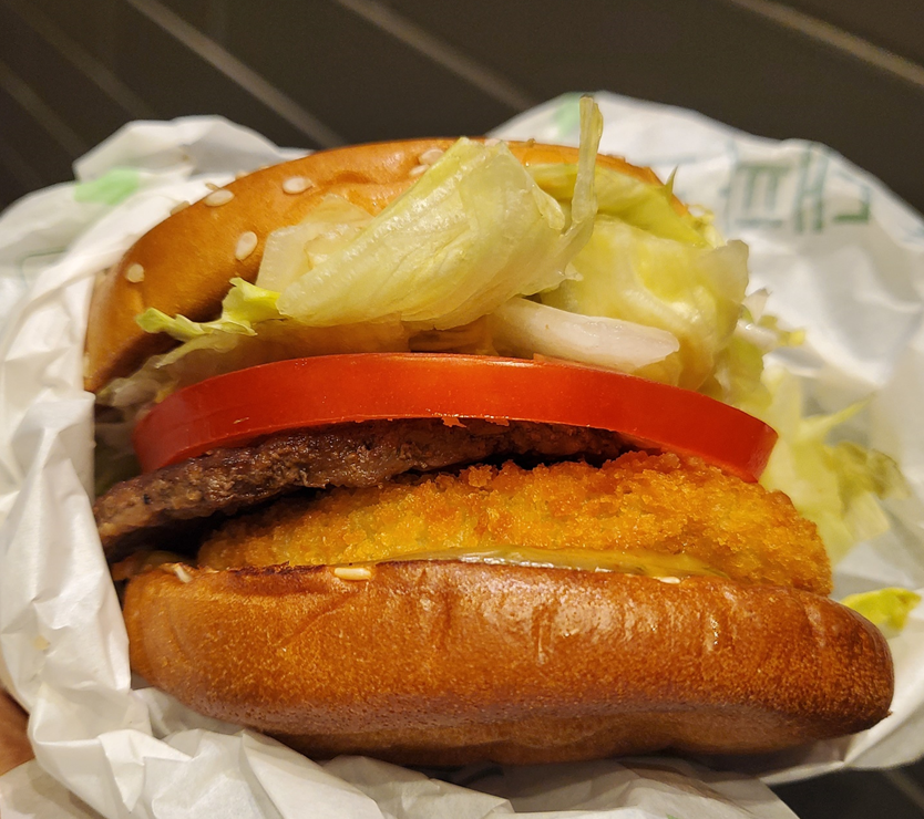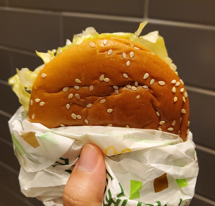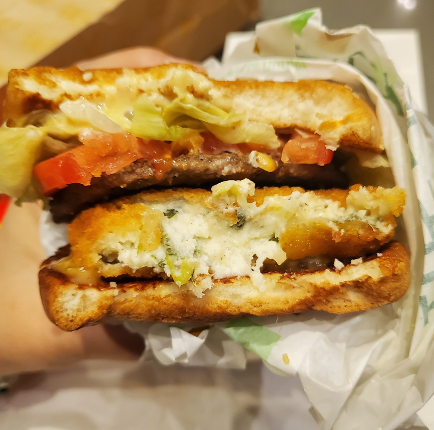 진도 대파 크림크로켓 버거도 빅맥처럼 종이가 싸여 나와요! 사이즈가 엄청 컸습니다! 아무래도 패티와 크로켓이 같이 들어가서 그런지 엄청 두툼하고 컸어요!ㅎㅎ 제 손가락이 커서 그런지 뚱카롱만하게 나왔지만..ㅎㅎ 사이즈가 꽤나 컸습니다. ㅎㅎ 고기 패티는 그렇게 많이 두껍진 않아요.ㅎㅎ 크로켓도 무겁기 때문에 고기 패티의 두께를 줄인 듯합니다. ㅎㅎ 그리고 양상추가 듬뿍, 슬라이스 된 토마토 한 장이 들어가요 ㅎㅎ
