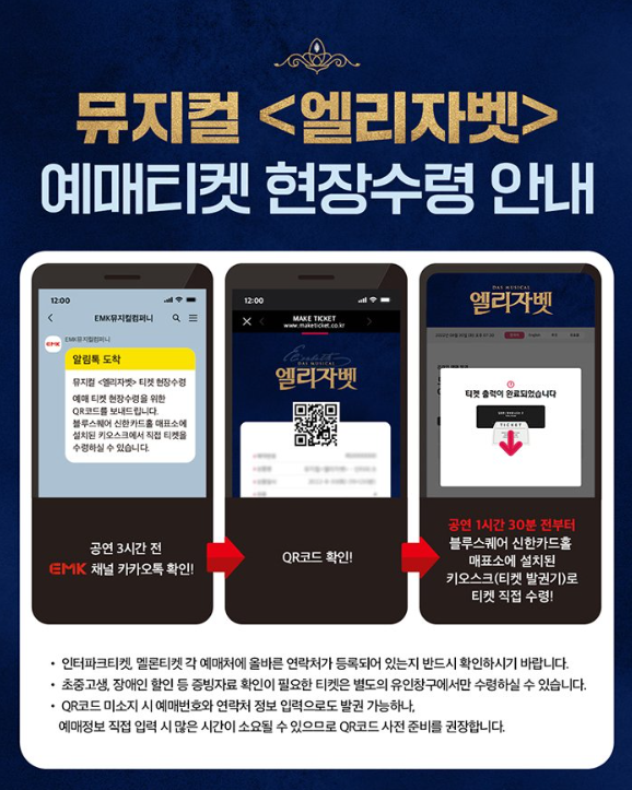 티켓은 인터넷 예매 후 공연 당일 3시간 전에 카카오톡으로 메시지가 옵니다. QR코드가 나오는 링크가 있는데, 링크를 누르고 키오스크에서 직접 발권을 하는 시스템인데 많은 분들이 키오스크에서 큐알을 어떻게 찍는 건지 헤매시다가 포기하고 다시 줄을 서는 경우가 있더라고요.ㅠ 큐알코드를 킨 상태에서 키오스크의 가운데에 있는 키오스크 리더기에 가져다 대면 되는 거니까 포기하지 마시고 그냥 가져다 대보세요!ㅠㅠ 가져다 대도 안 된다 싶으면 핸드폰을 돌려서 위치를 다시 맞춰보면 소리가 나면서 발권이 되실 거예요!ㅎㅎ그래도 어려우신 경우에는 4번 키오스크는 예매번호로 발권이 가능하니 4번에서 받으시면 됩니다.ㅎ 3층 객석이 있는 층에 키오스크가 있습니다~