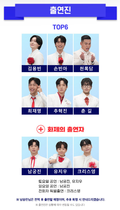 - 미스터트롯3 TOP6(김용빈, 손빈아, 천록담, 최재명, 추혁진, 춘길) , 남궁진(토, 일), 유지우(토), 크리스영(전회차 특별출연)
