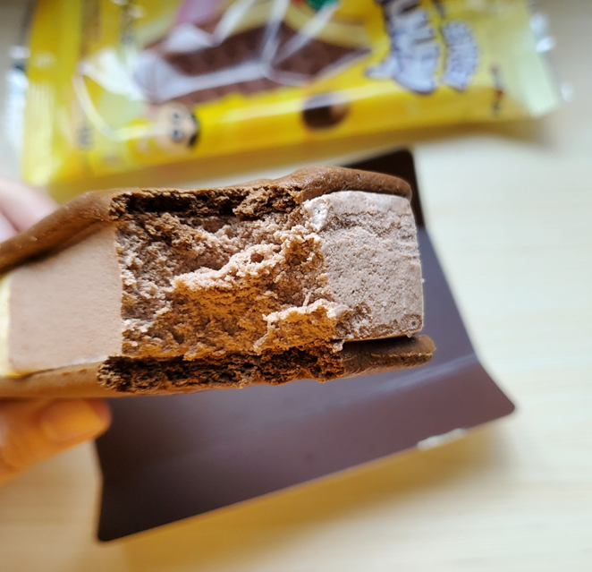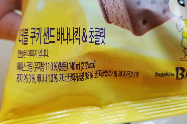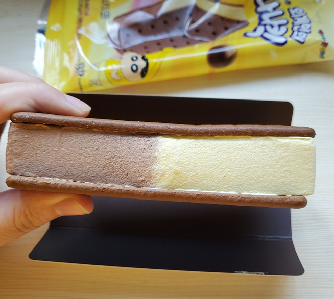 단면은 이렇습니다. ㅎㅎ 바나나 맛 아이스크림과 초코 아이스크림이 분리되어 양쪽을 다른 맛으로 먹을 수 있어요.ㅎㅎ 초코는 다들 아시는 그 맛이고, 바나나 맛을 먹었을 땐 쿠키가 아이스크림을 좀 싱겁게 만든다고 할까요? 뭔가 조화가 애매하게 느껴졌습니당..ㅎㅎ
