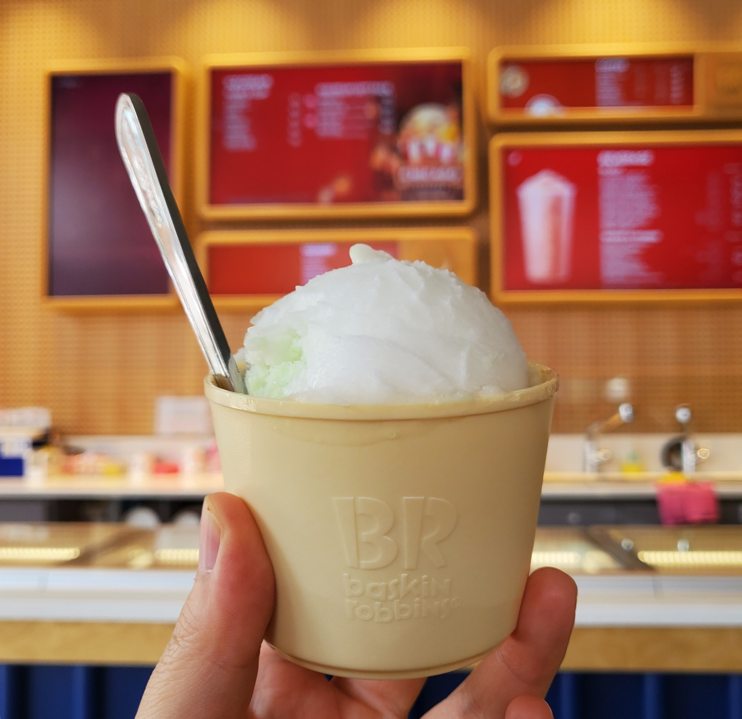 원래는 바나나 쥬빌레를 먹고 싶었는데 제가 방문한 매장은 청포도 샤베트밖에 없더라고요! 날씨도 더운데 상큼하고 시원하게 먹어보자 하고 청포도 샤베트를 주문했습니다. ㅎㅎ 애플민트랑 비슷하게 생긴 것 같아요!ㅎㅎ