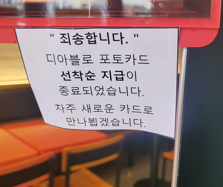 디아블로 포토카드 이벤트가 있었나 보네요! 홈페이지를 보니 매장이나 딜리버리 채널을 통해서 주문했을 때 한 장씩 제공이 되는데, 선착순 배포이기 때문에 이미 소진이 된 듯합니다! 2차, 3차까지 새로운 카드를 배포한다고 공지되어 있는데 관심 있는 분들은 다음 새 카드 배포일에 바로 달려가보시는 것이 좋겠네요!ㅎㅎ