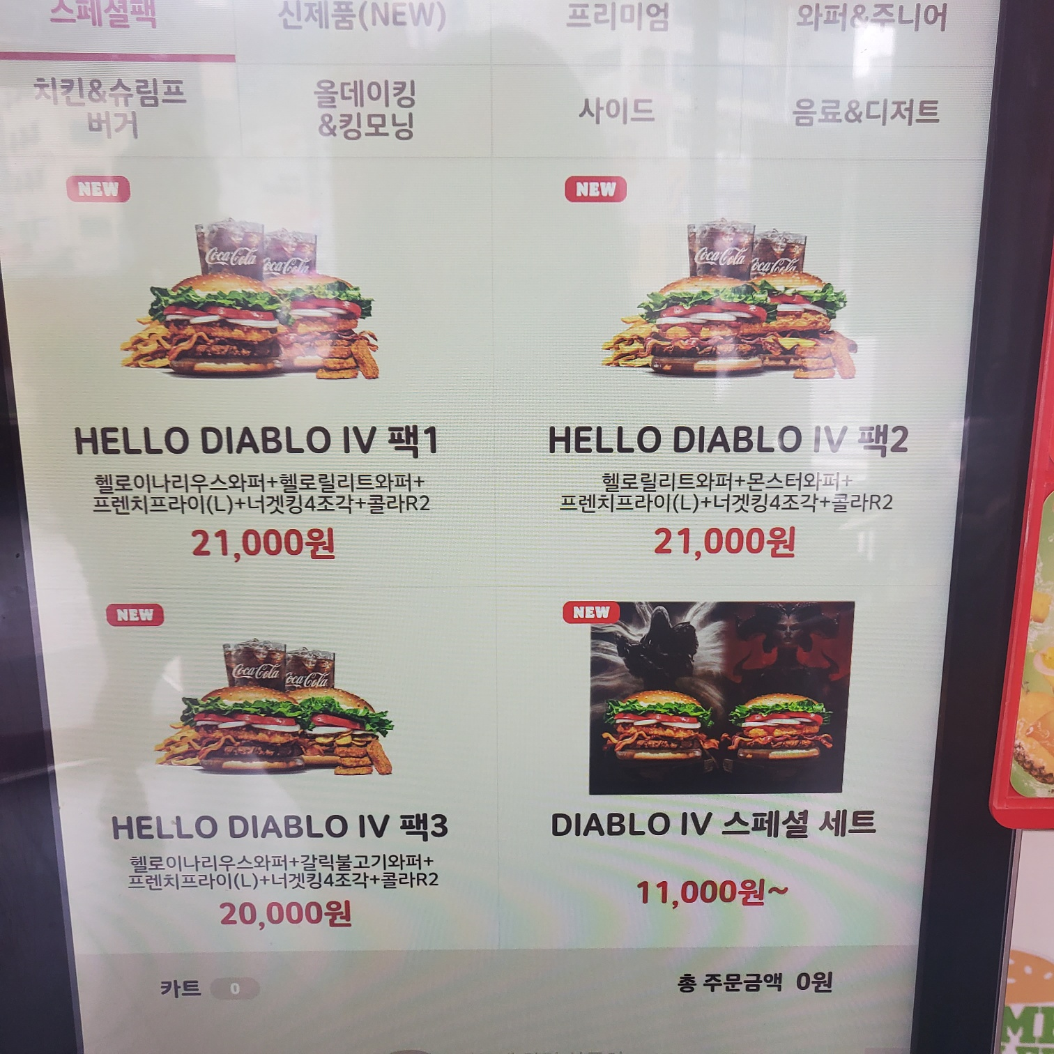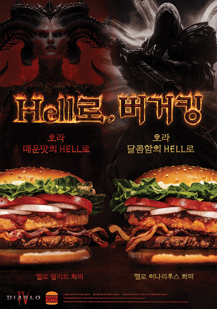 퇴근길에 맥도날드를 가려했는데 저희 동네는 맥도날드는 버거킹이 붙어 있어서 버거킹을 지나쳐서 가야 한답니다.ㅎㅎ 지나가는 길에 버거킹 앞에 붙어 있는 포스터를 보고 저게 뭐지? 하고 뭔가에 이끌리듯 들어갔어요.ㅎㅎ 어릴 때 오빠들이 많이 하던 디아블로더라고요! 요즘 뉴스에서도 디아블로 재열풍이라고 봤었는데 저는 사실 너무 어릴 때였고, 캐릭터가 어린아이의 눈에서는 다소 무서우면서 난해한 캐릭터였기 때문에 관심을 갖지 않았었어요.ㅎㅎ 각설하자면, 저는 게임보다는 버거 사진 때문에 사 먹게 되었다는 내용입니다. ㅎㅎ이번에 게임이 나오면서 버거킹과 콜라보를 했네요!