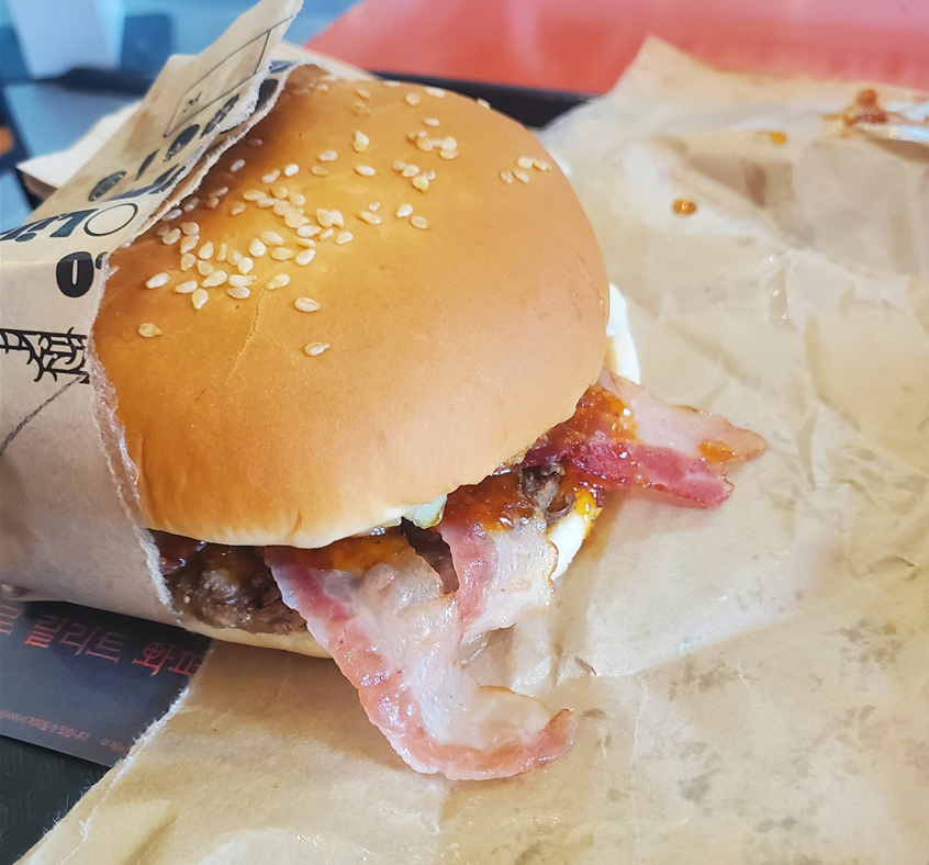 맛은! 정말 맛있었습니다. ㅎㅎ 맥도날드도 좋아하지만 이 때만큼은 맥도날드 안 가고 버거킹 오길 잘했다는 생각 많이 했어요.ㅎㅎ 양도 양이지만, 빵과 소스, 패티, 감자튀김, 베이컨 어느 하나 튀는 것 없이 자극적이지 않았고, 스위트 칠리소스와 비슷한 맛의 베이컨 잼이 들어가 짠맛이 느껴질 때에는 달달한 소스가 나오고, 그 둘을 융합시키는 담백하고 고소한 빵이 커버해 주면서 해쉬브라운, 패티, 베이컨이 골고루 섞이면서 하나의 맛으로 정리가 된다고 느꼈어요. ㅎㅎ 감자와 패티, 베이컨이 생각보다 잘 어울리더라고요!