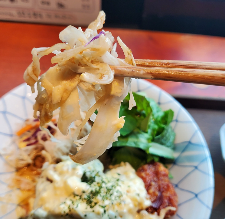 양배추와 로메인이 반반 나왔는데 샐러드 양이 참 많았어요! 거의 치킨 난반만큼의 양으로 나왔습니다. ㅎㅎ 치킨 먹을 때 닭다리 살이라 조금은 느끼할 수 있는데 그때마다 충분히 넉넉하게 샐러드로 입가심을 하기 좋았어요.ㅎㅎ 오리엔탈 드레싱이 나오기 때문에 치킨과 결이 같은 맛으로 즐길 수 있었습니다. ㅎㅎ