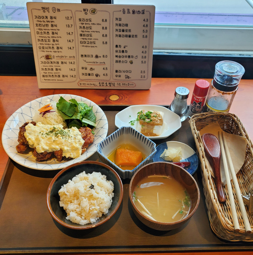그리고 저는 고민 끝에 치킨난반 정식을 주문했습니다. ㅎㅎ 밥, 반찬, 장국은 무료로 추가가 되더라고요!ㅎㅎ 산도 종류도 인기가 많더라고요! 많이들 드시고요! 저는 혼자라서 양이 많을 거 같아서 추가 주문은 하지 않았습니다.ㅠㅠ 다음에 동행인을 데려가 같이 먹어야겠어요!ㅠㅎㅎ