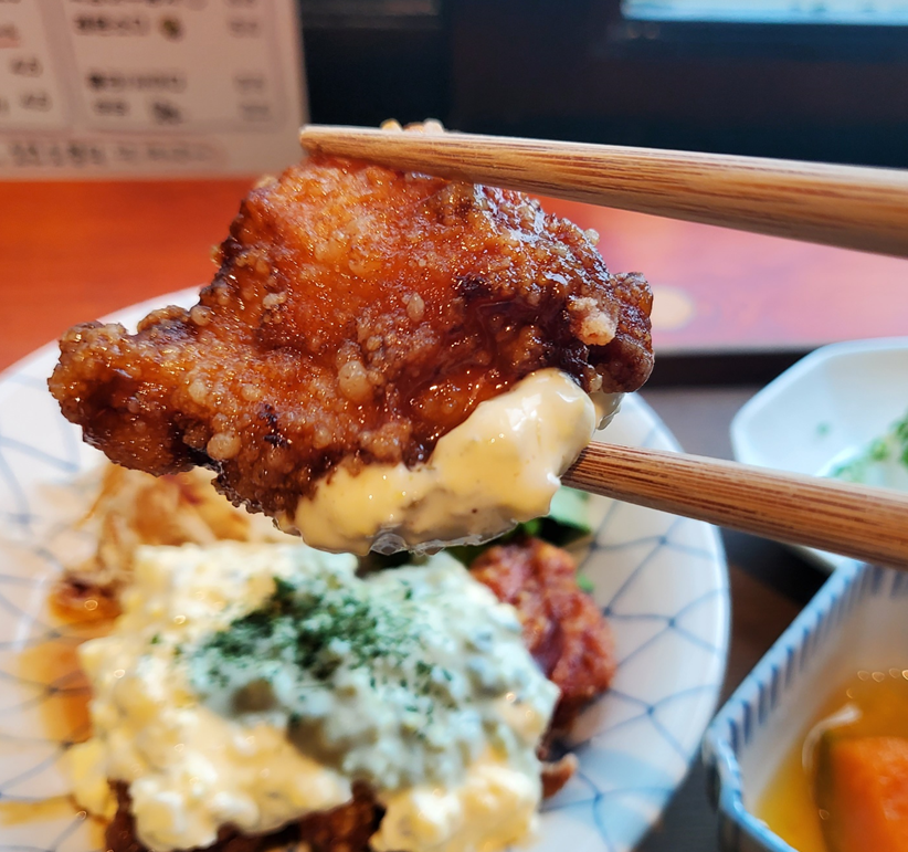 원래 일본의 닭 요리는 좀 짠 편이죠! 거기에 소스에 절여졌기 때문에 다소 짤 수 있어요. 그런데 타르타르소스가 짠맛을 잡아주는 역할을 해주었어요. ㅎㅎ