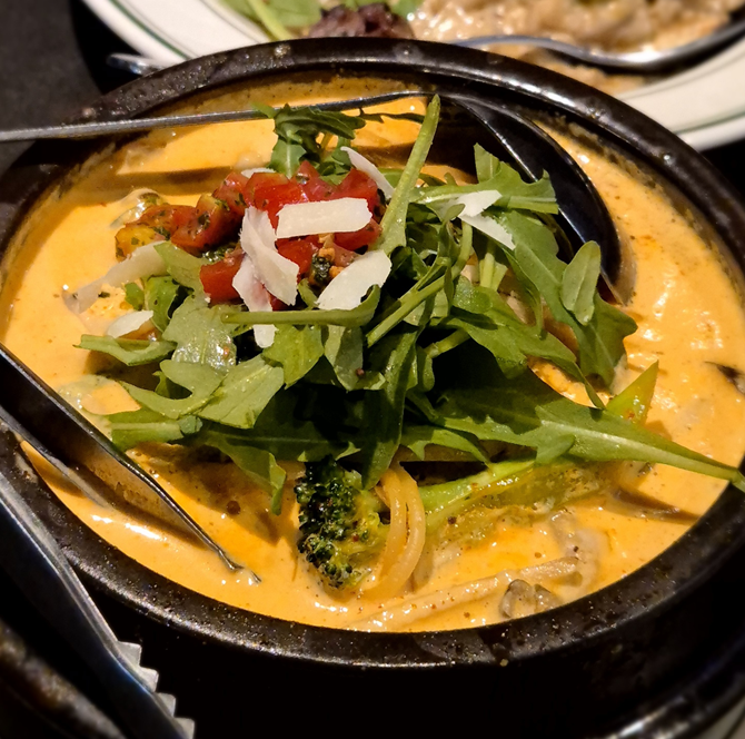다음으로 해물 크림 뚝배기입니다. 뚝배기 안에 매콤한 크림소스와 파스타면, 해물, 소고기, 누룽지까지 아낌없이 푸짐하게 들어가 있었습니다. 친구가 국물과 크림을 정말 좋아하는데 해물크림뚝배기가 최고라고 하더라고요.ㅎㅎ 저는 술을 즐기지 않지만 술을 마신 후에 먹는다면 해장이 잘 될 것 같다는 생각이 들었습니다. ㅎㅎ 저는 식전빵을 국물에 찍어 먹었는데도 맛있더라고요!ㅎㅎ 해물 크림 뚝배기도 인위적인 맛이 나지 않아서 먹는 내내 입안이 편했습니다.