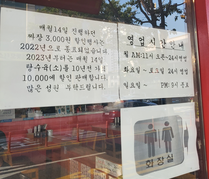 외부에서는 보니 평일 점심 할인 행사를 하더라고요! 저는 짜장면 3천 원 주고 사 먹었던 시대인데 할인 행사가 4,900원이라니 세상 참 빠르게 변했다는 걸 느끼네요..ㅠㅎㅎㅎ