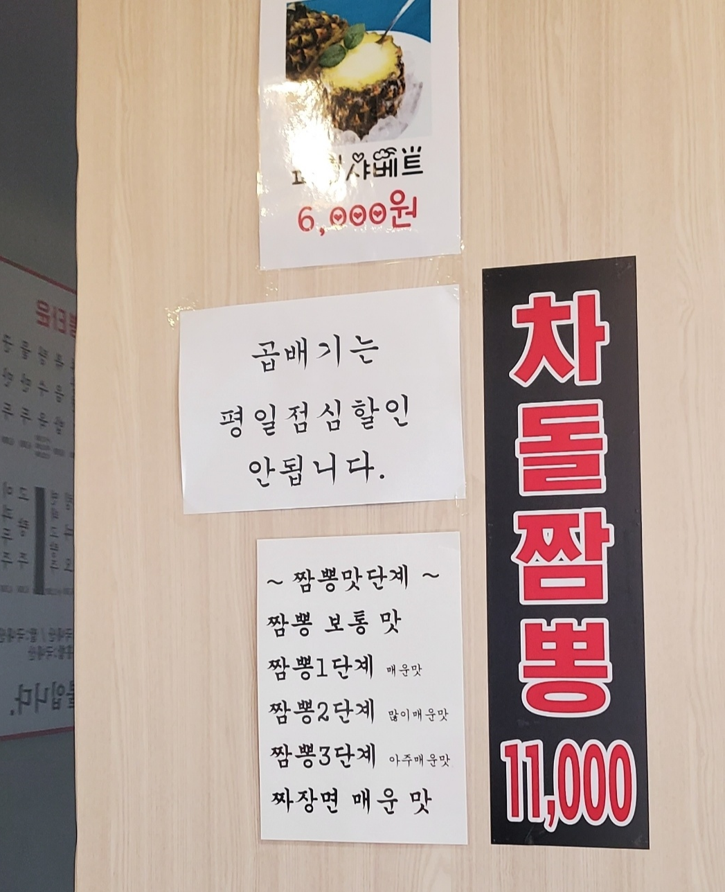 메뉴판에 있는 메뉴 외에 차돌 짬뽕도 있고, 파인 샤베트도 있네요.ㅎㅎ 짬뽕은 단계로 고를 수 있어요! 그리고 곱빼기는 평일 점심 할인에서 제외가 되네요!