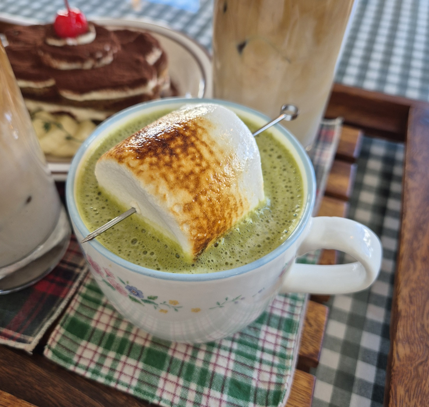 제가 주문한 녹차라떼입니다.ㅎㅎ 녹차라떼에 예상하지 못한 대왕 마시멜로에 정말 놀랐습니다.ㅎㅎ 이런 비주얼을 상상하지 못 했어요!