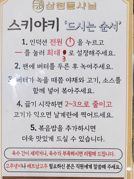 샤브샤브와 스키야키 먹는 순서가 나와 있어요.ㅎ 샤브샤브는 최대 9, 스키야키는 최대 3으로 해서 끓여야 하더라고요. 샤브샤브는 채소를 넣어 끓으면 2-3으로 불의 세기를 줄이고 고기를 익히면 됩니다. 그 후에 면과 죽을 넣어 끓이면 됩니다.ㅎㅎ