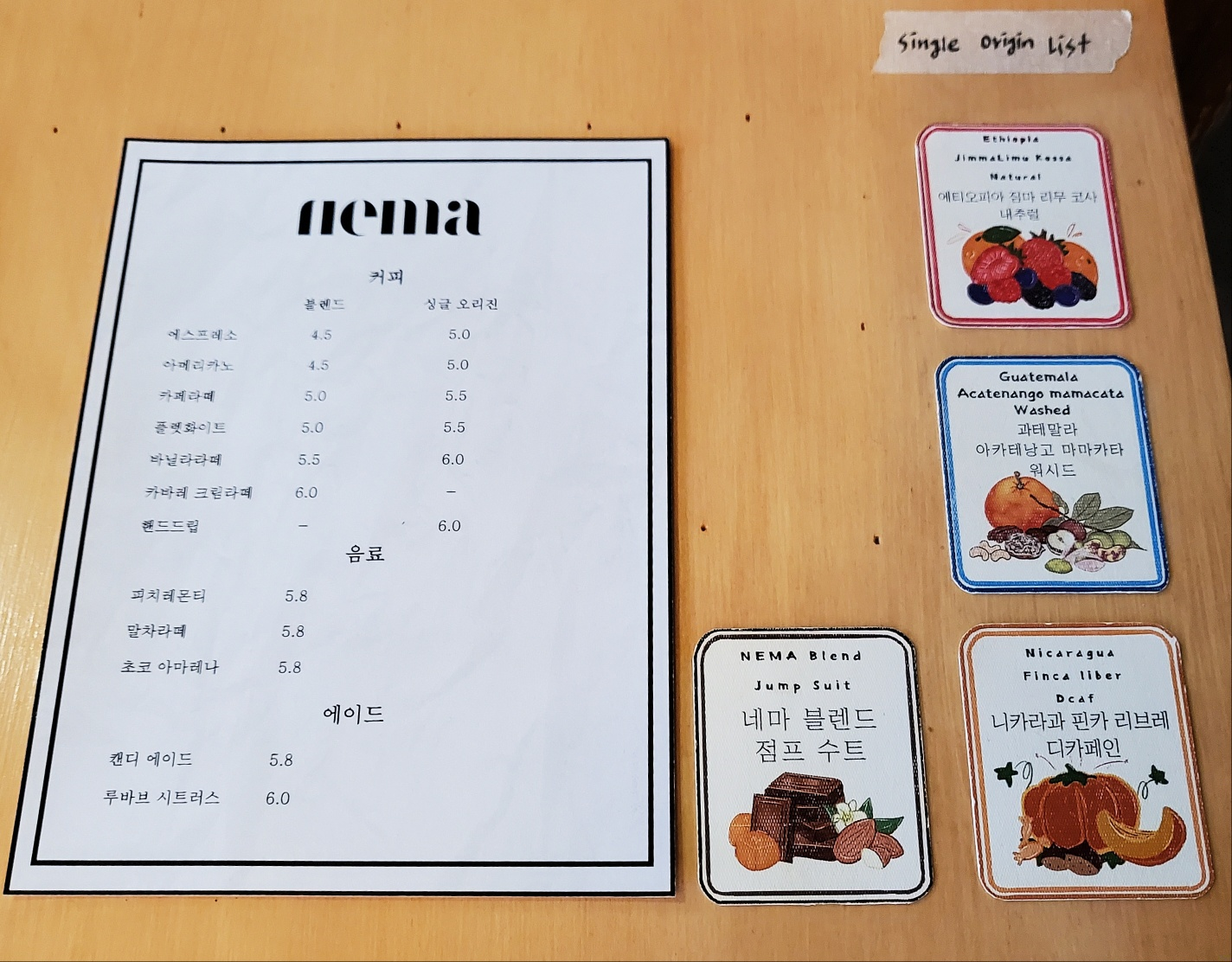 음료 메뉴는 카운터 테이블 앞에 붙어 있습니다! 핸드드립 커피는 원두를 고르실 수 있는데, 옆에 네 가지 카드 참고하시면 돼요! 저는 니카라과 핀카 리브레 디카페인을 선택했어요. ㅎㅎ