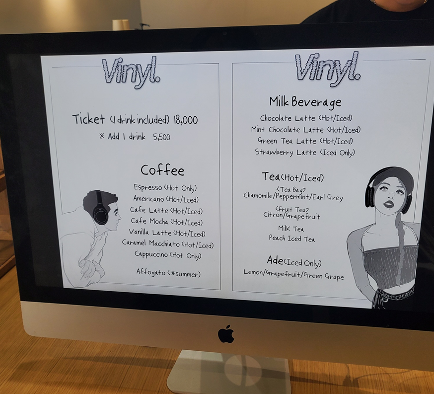메뉴판도 평범하지 않습니다.ㅎㅎ 입장료가 18,000원으로 음료가격이 포함된 가격이에요! 아이맥 메뉴판을 보고 메뉴를 정하시면 됩니다. ㅎㅎ 저는 청포도에이드를 주문했아요.ㅎ 음료를 주문받으면 자리에 앉아 있으면 음료를 가져다주신다는 사장님의 안내를 받게 됩니다. ㅎㅎ