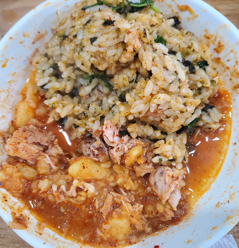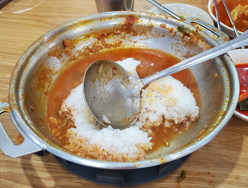 남은 국물 위에 밥을 덜어 슥삭 슥삭 비벼줍니다. ㅎㅎㅎ 방금 볶아서 너무 뜨거운데 적당히 식은 국물과 비벼 먹으니 온도가 딱 좋았습니다.ㅎㅎㅎ 이렇게 먹는 법을 몰랐는데 친구가 알려준 방법대로 먹으니 새로운 요리 같았어요.ㅎㅎ 정말 배 터질 때까지 먹은 듯합니다.ㅎㅎㅎ