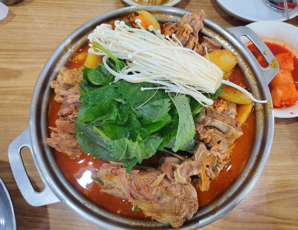 냄비 하나로 푸짐한 감자탕이 나왔습니다. ㅎㅎ 깻잎도 필수죠!ㅎ 팽이버섯도 듬뿍 올라와 있는데, 뜨겁지 않을 때 찢어놔야 더 편하게 먹을 수 있겠더라고요!ㅎㅎㅎ