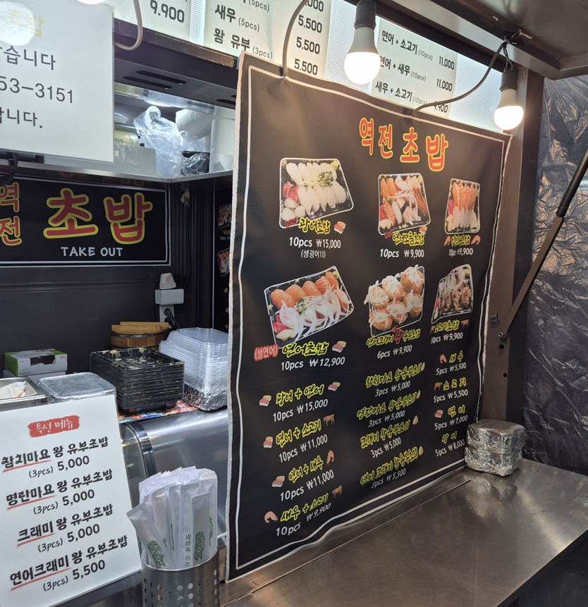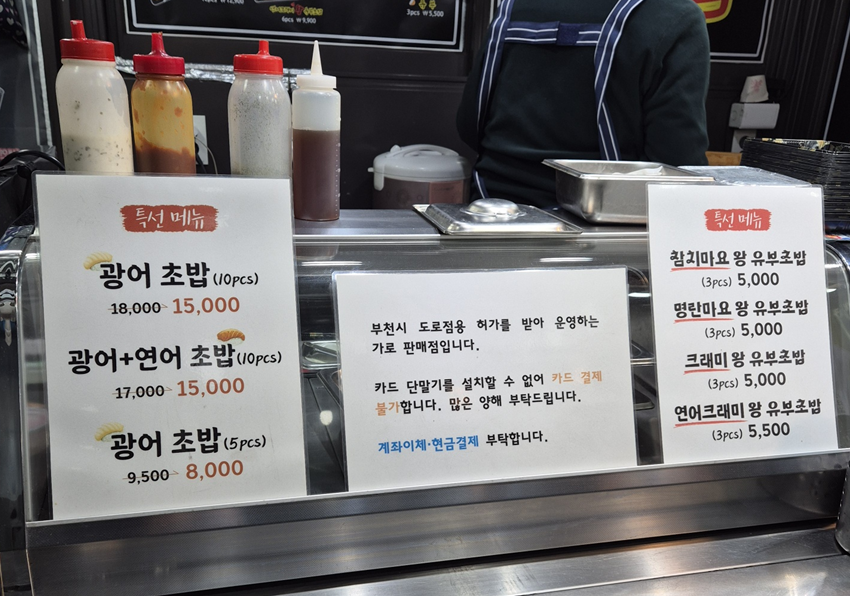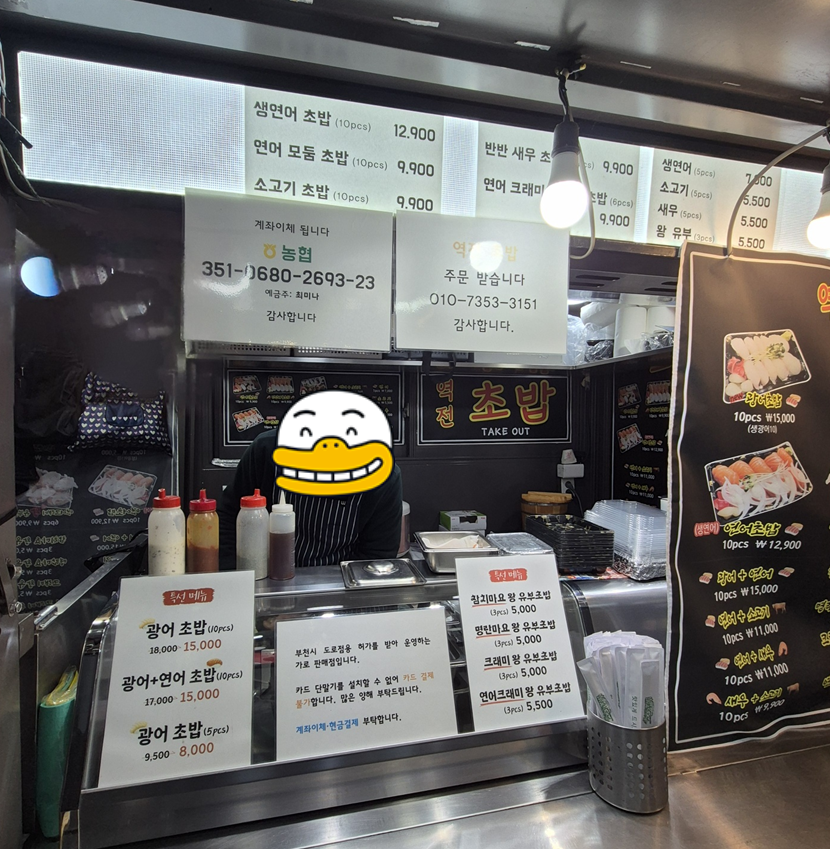 가판대라서 카드 결제가 불가능하기 때문에 현금이나 계좌이체만 가능해요! 저도 주문 후 바로 계좌 이체 해드렸습니다.ㅎㅎ 생선 초밥뿐만 아니라 유부초밥도 판매 중이라 취향에 맞게 먹을 수 있을 것 같아 좋았습니다.ㅎㅎ