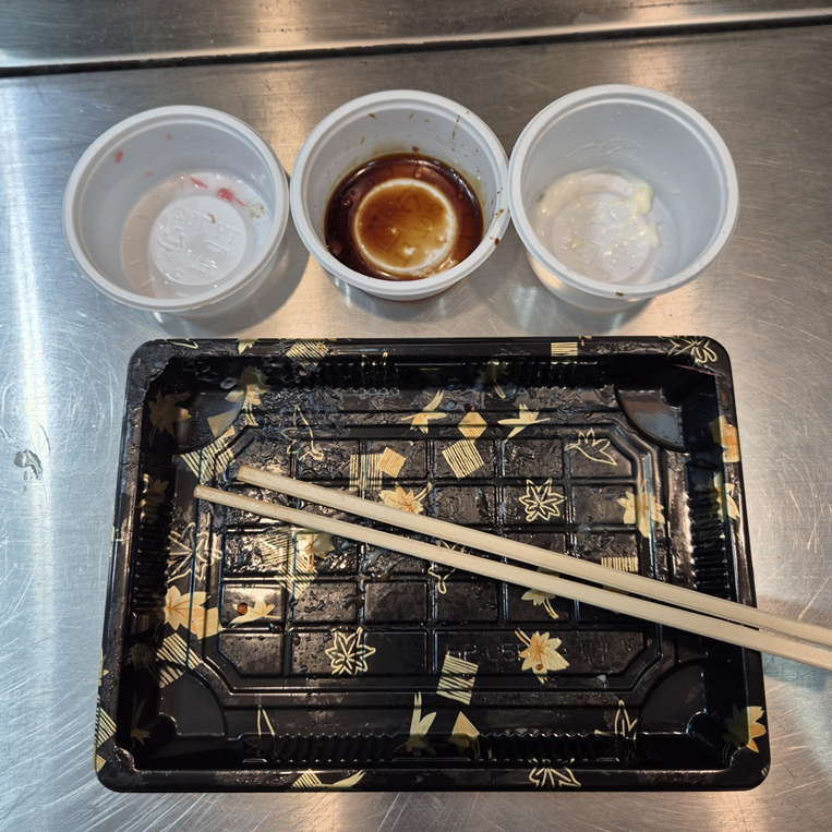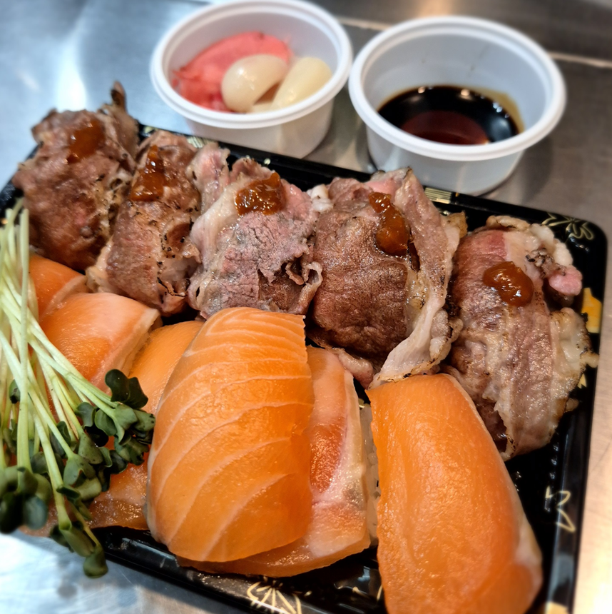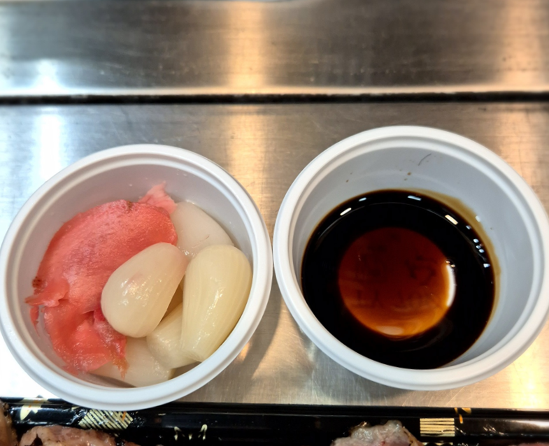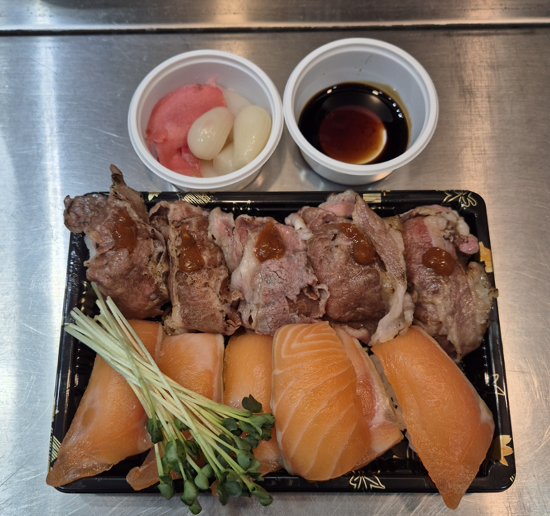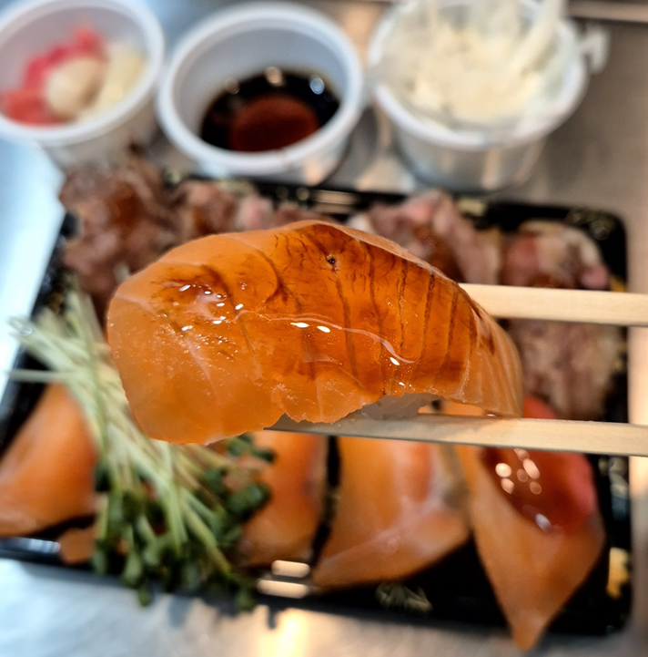 주문하면 사장님께서 바로 초밥을 만들어 주십니다. 연어 초밥과 함께 소고기 초밥이 나왔어요! 저는 가판대라 비주얼에는 기대를 안 했는데 그럴싸하게 일반 초밥집에서 구매하는 것과 별반 다를 것이 없었습니다.ㅎㅎ 생강, 락교도 주시고 간장대신 데리야끼 소스를 주셨어요.ㅎㅎ