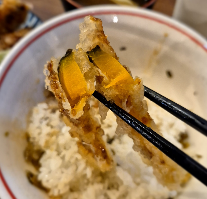 먼저 저스트텐동 단품이 나왔습니다. 새우 2마리, 단호박, 느타리 버섯, 꽈리고추, 김, 수란이 나옵니다. 꽈리고추는 매운 것도 있고, 맵지 않은 것도 나오니 조심해서 드세요!