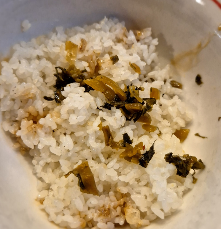 고슬고슬한 밥 위에 장아찌가 올라와 있습니다. 아마 성인 남성에겐 밥이 좀 부족할 것 같습니다.