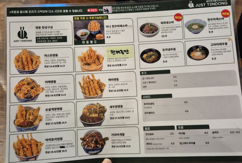 저는 저스트 텐동 단품과 한상, 야끼토리동을 주문했습니다.