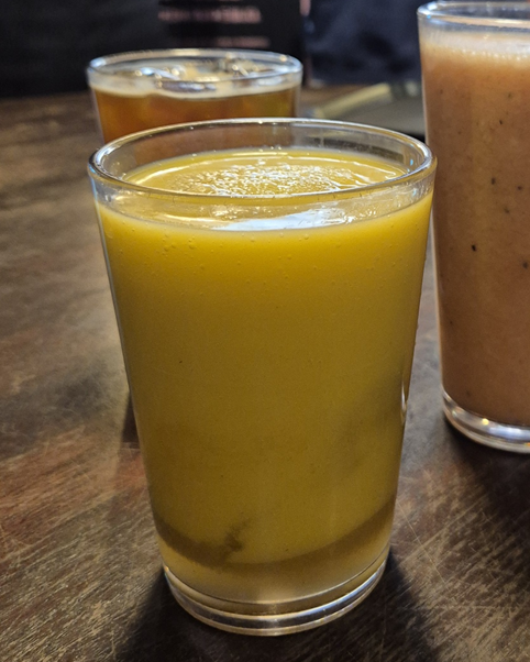 제가 주문한 조 주다무어입니다. 선홍빛을 띠고 있는 주스입니다. 우선 파인애플, 사과, 딸기 등 새콤한 과일의 비중이 많기 때문에 신맛이 강했습니다. 처음엔 단맛이 있다가 끝에 신맛이 입 안에 남는데 여러 과일이 섞어 나무 풋내가 나는 것 같았습니다. 하지만 5가지 과일이 들어가서 그런지 포만감도 높고 건강하게 한 끼를 간단히 할 수 있는 메뉴였던 것 같습니다.