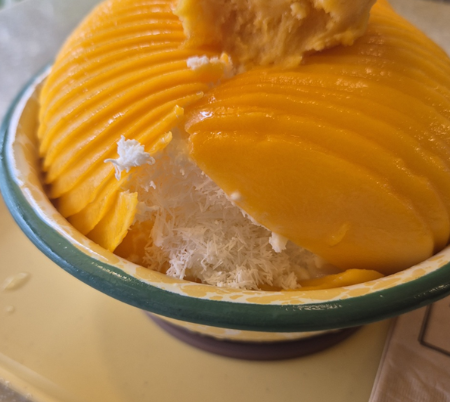 생애플망고와 그래놀라, 눈꽃우유, 망고소르베가 들어가는 꽤 가격이 비싼 메뉴예요.
