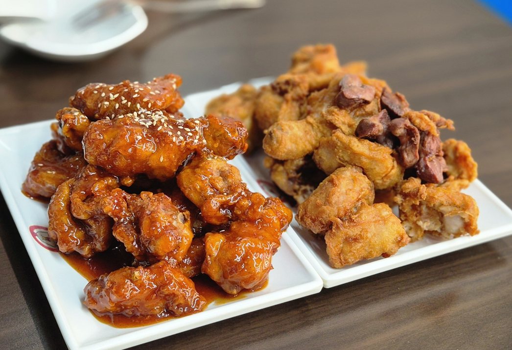 바삭하게 튀겼지만 속이 촉촉했던 후라이드와 매콤달콤한 양념으로 버무려진 반반 치킨입니다. ㅎ 두 가지 맛을 동시에 즐길 수 있는 맛으로 취향에 맞게 먹기 좋더라고요.ㅎㅎ 게다가 후라이드 위로 올려주는 닭똥집 튀김이 별미였는데 쫄깃하고 담백하게 즐길 수 있는 메뉴였습니다.ㅎㅎ