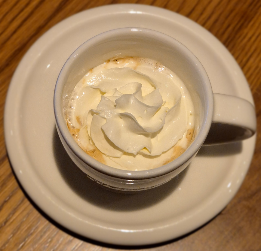 따뜻한 에스프레소 샷에 차가운 생크림이 올라간 커피입니다.ㅎㅎ 컵도 하얗고 크림도 하얘서 장난감 갖고 너무 귀여웠습니다.ㅎㅎㅎ 섞지 않은 채로 첫 맛을 느껴 봤는데 휘핑 크림의 단맛과 에스프레소의 쓴맛이 순서대로 느껴지다가 마지막에 다시 크림의 단맛이 올라와 너무 강한 에스프레소 맛의 부담이 없었습니다. ㅎㅎ