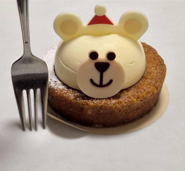 버터 케이크 위에 라즈베리 잼이 들어간 마스카포네 치즈 크림이 올라간 곰 모양의 귀여운 케이크입니다. 크리스마스 분위기에 딱이지요! 이 케이크로 놀란 두 가지 포인트가 있습니다.