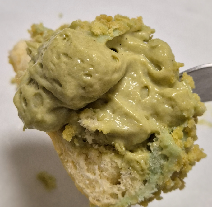 두툼하고 큼직한 도넛위에 피스타치오 초코가 덮여 있고, 그 위로 크림 크럼블이 빼곡하게 붙어 있습니다.