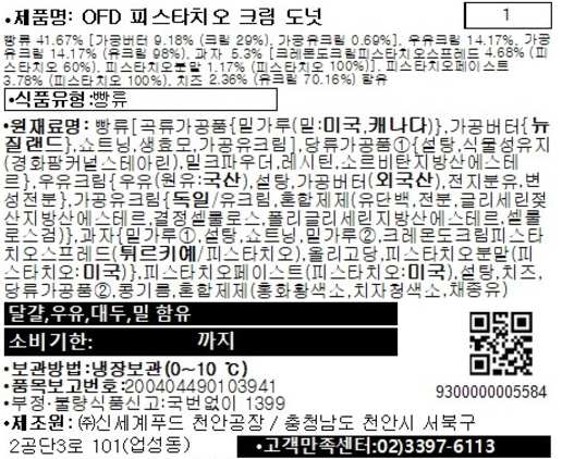 다음은 OFD 피스타치오 크림 도넛입니다. 지난 포스팅에서 보였던 OFD더블 베리 크림 도넛과 더불어 올드페리도넛과 협업한 도넛이지요. 피스타치오 크림과 쿠키 크럼블이 함께해 진한 풍미가 특징인 도넛입니다.