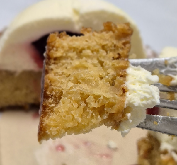 단면을 보면 버터 케이크 위에 치즈 크림이 올라가 있어 그 안에 라즈베리 잼이 흘러 나옵니다.