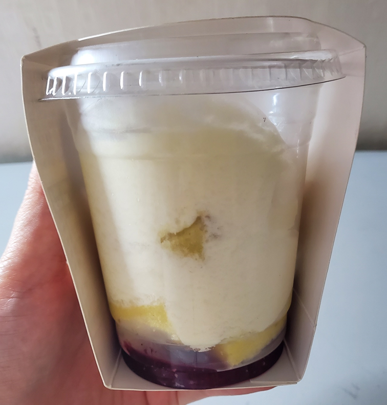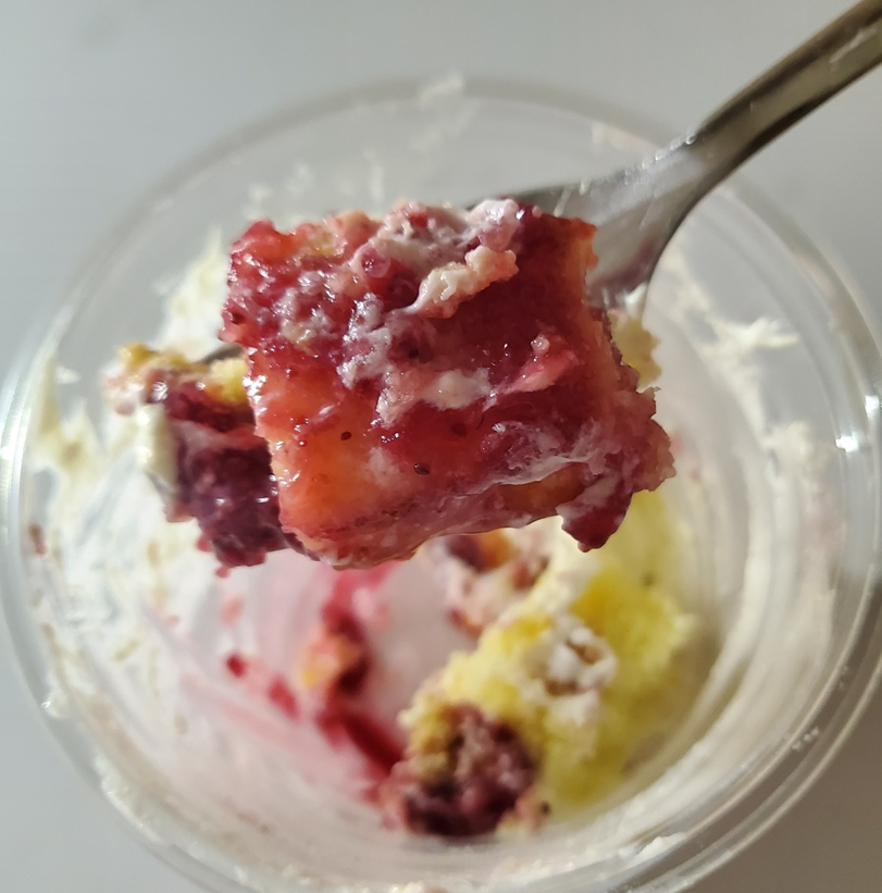 사실 이미지를 봤을 때는 너무 예쁘다 싶었던 것도 있는데 실물을 받아보니 평범해서 살짝은 실망했지만 그래도 라즈베리 과육이 섞여 맛을 더 조화롭게 할 거라 생각을 하며 기대를 하게 되었습니다. ㅎㅎ 그런데 저는 생각보다 안에 들어이는 과육이 적었어요. 라즈베리 한 3알 들어갔나..? 싶었습니다. ㅠ