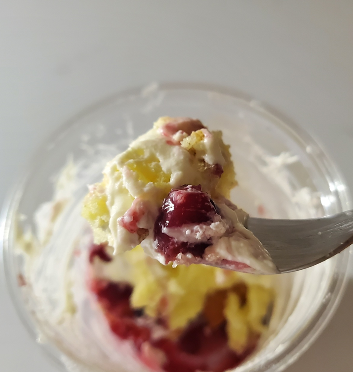 다만, 콩포트에 절여진 케이크 시트는 정말 눈이 번쩍 뜨여질 정도로 너무 달았습니다! 생크림, 큐브 치즈와 같이 비율을 맞춰 먹어야 할 것 같더라고요! 밑에 있는 콩포트에 절여져서 케이크 시트가 너무 강렬하게 저의 혀를 강타했습니다..ㅎㅎ 이후로 생크림과 함께 잘 덜어 먹었는데 비주얼이 그다지 좋지 않아 사진을 못 찍었네요.ㅠㅠ