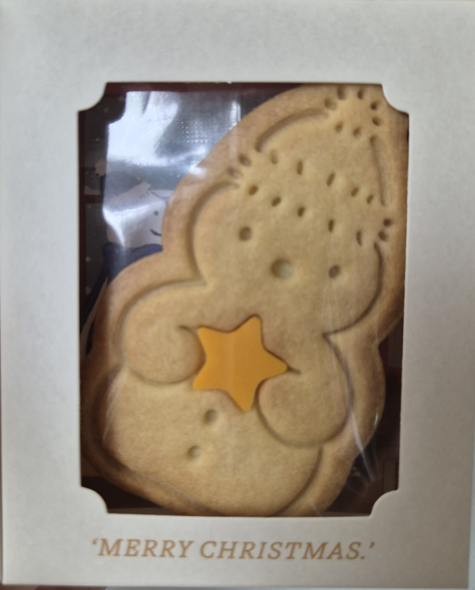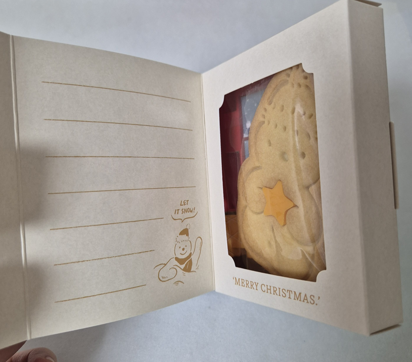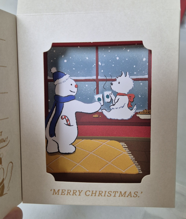 노란 초콜릿 별을 들고 있는 눈사람 쿠키가 밀봉되어 들어 있습니다. 눈사람 쿠키 뒤에는 눈사람과 강아지가 티타임하고 있는 배경이 있어요. 이것도 너무 귀엽고 크리스마스 분위기가 물씬 풍기네요.ㅎㅎ