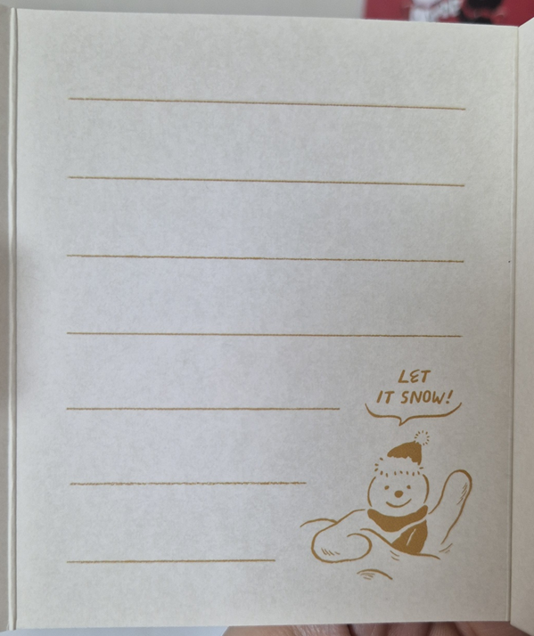 뚜껑을 열면 쿠키와 뚜껑 면에 카드를 쓸 수 있는 공간이 있습니다. 눈사람 쿠키에는 let it snow라고 눈사람 일러스트가 그려져 있어요. ㅎㅎ